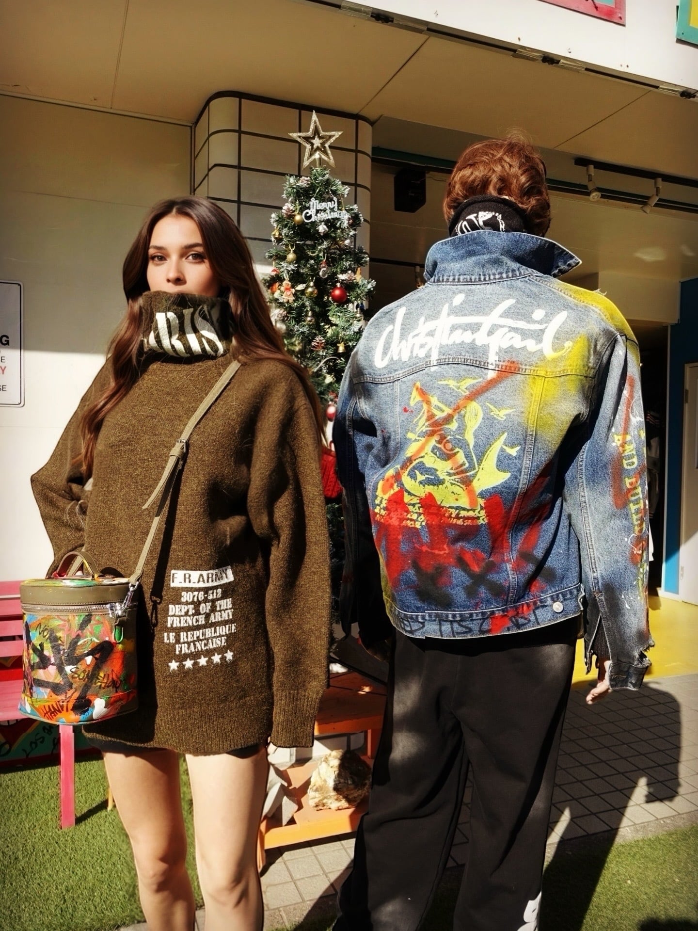 存在感のあるオーバーシルエットで仕立てた、フード付きのアウターコート。 軽量なポリエステル素材を採用し、驚くほど軽やかな着心地でありながら、しっかりとした中綿によって高い保温性を発揮。 冬のメインアウターとして、デザイン性と機能性の両面から優れたパフォーマンスを叶えます。 フロント・バック・袖口には、Christian Gailのハンドタッチによるペイントアートとグラフィックを施し、唯一無二の存在感を放つ仕上がりに。 裾やフード周りにはディテールへのこだわりが光り、ストリートムードとモード感が共存するデザイン。 デイリーコーデはもちろん、スタイリングの主役としてシーズンを通して活躍してくれます。 L 身幅138cm 着丈69cm XL 身幅140cm 着丈83cm