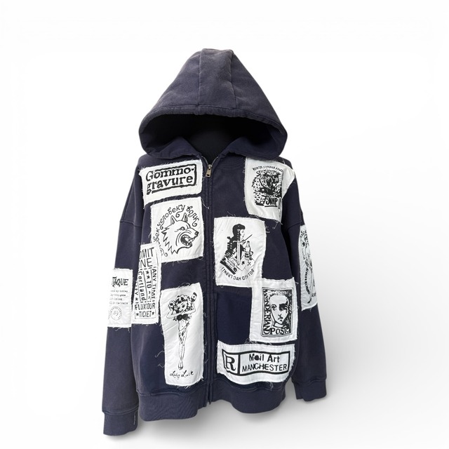 オリジナル ジップパーカー 布地に一点ずつグラフィックを施し、 それぞれをジップパーカーへ一点ずつ縫い合わせた、オリジナルアイテムです。 量産では表現できない、コラージュのような表情と立体感が魅力となっています。 ベースには、裏起毛仕様の上質な素材を使用。 程よい厚みと柔らかさがあり、保温性にも優れているため、 秋冬シーズンはもちろん、春先まで快適にご着用いただけます。 一枚一枚表情が異なるため、すべてが一点物。 スタイリングの主役として、存在感のある一着に仕上がっています。 カジュアルながらもアート性の高いデザインで、 シンプルなボトムスと合わせるだけでも、完成度の高いコーディネートをお楽しみいただけます。 XL 肩幅80cm 身幅146cm 着丈71cm
