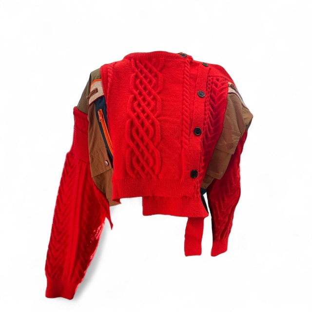 アシンメトリーなデザインが魅力的なリメイクニット。ショート丈でゆったりとしたシルエットが、体型をカバーしつつスタイルアップを実現。 ウエストまでの丈感が、すっきりとした印象を与えます。厚手のニット素材は保温性にも優れ、寒い季節にぴったり。 ブルゾンリメイクと太めの編み目がアクセントとなり、シンプルな中にも個性を感じさせます。 ジャケットとしても、トップスとしても活躍する万能アイテム。どんなシーンにもフィットし、こなれ感を演出します。 FREE SIZE (M) 肩幅68cm 身幅146cm 着丈48cm