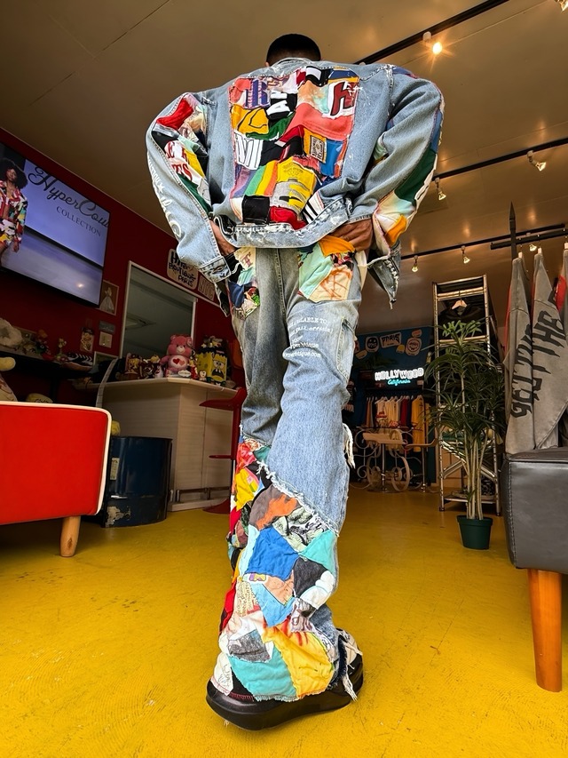唯一無二の存在感を放つ、Christian Gail コレクションラインのリメイクデニムパンツ。 ラフでルーズなシルエットに、ヴィンテージライクなダメージ加工と大胆なオリジナルパッチワークを施した一点ものアイテムです。 それぞれ異なる生地を組み合わせることで、奥行きのある表情と立体感を演出。 裾やポケット部分まで丁寧に再構築され、使用しているパッチワークは、Christian Gail コレクションラインの生地を採用しています。 手作業で仕上げられたオリジナルアート。 そのため、同じデザインは一つとして存在しません。 ワイドなシルエットながらもラインが美しく、ユニセックスで着用可能。 シーズンレスに活躍し、どのスタイルにもモードな抜け感をプラスします。 特別なプライスにも納得の、唯一無二のリメイクデニム。 アートとファッションが融合した、スペシャルな1本です。 メンズ175cm S着用 S30 ウエスト82cm 股上33cmわたり幅29cm股下78cm