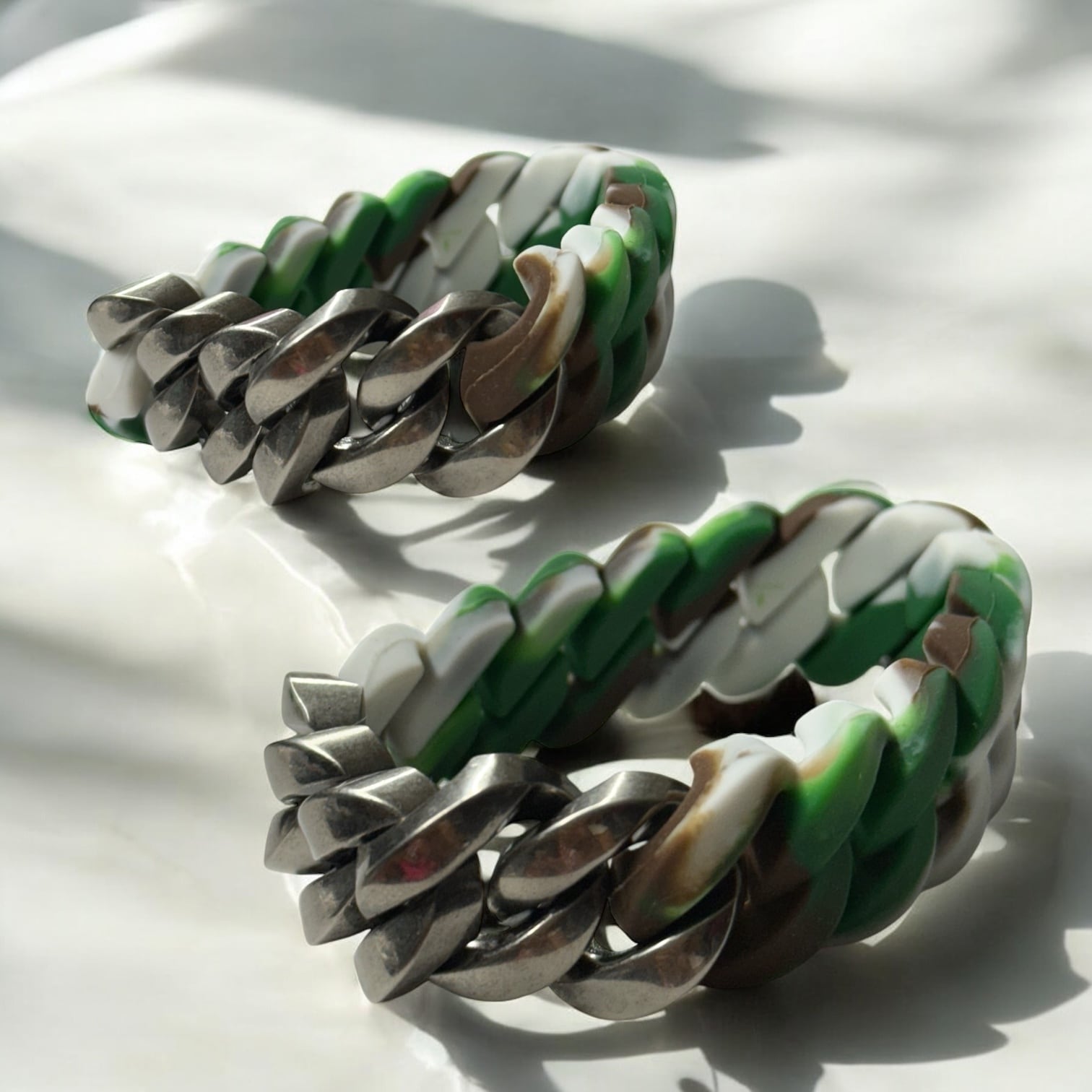 メタルの重厚感と、ゴムバンドのしなやかなフィット感が融合した、異素材ミックスのブレスレット。