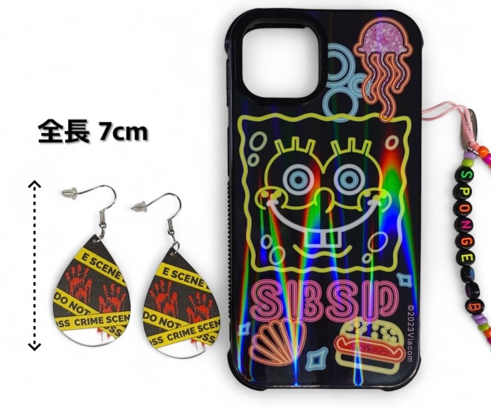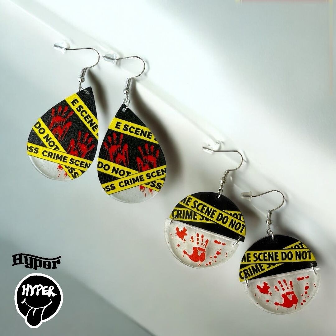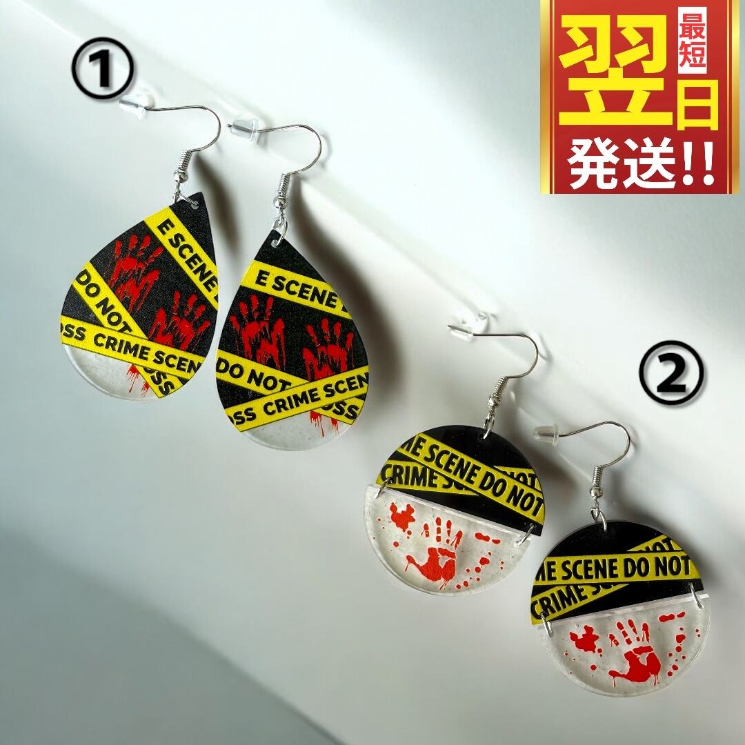 CRIME SCENEと血痕のついた手のひらをモチーフにした、遊び心とインパクトたっぷりのアクリルピアスです。