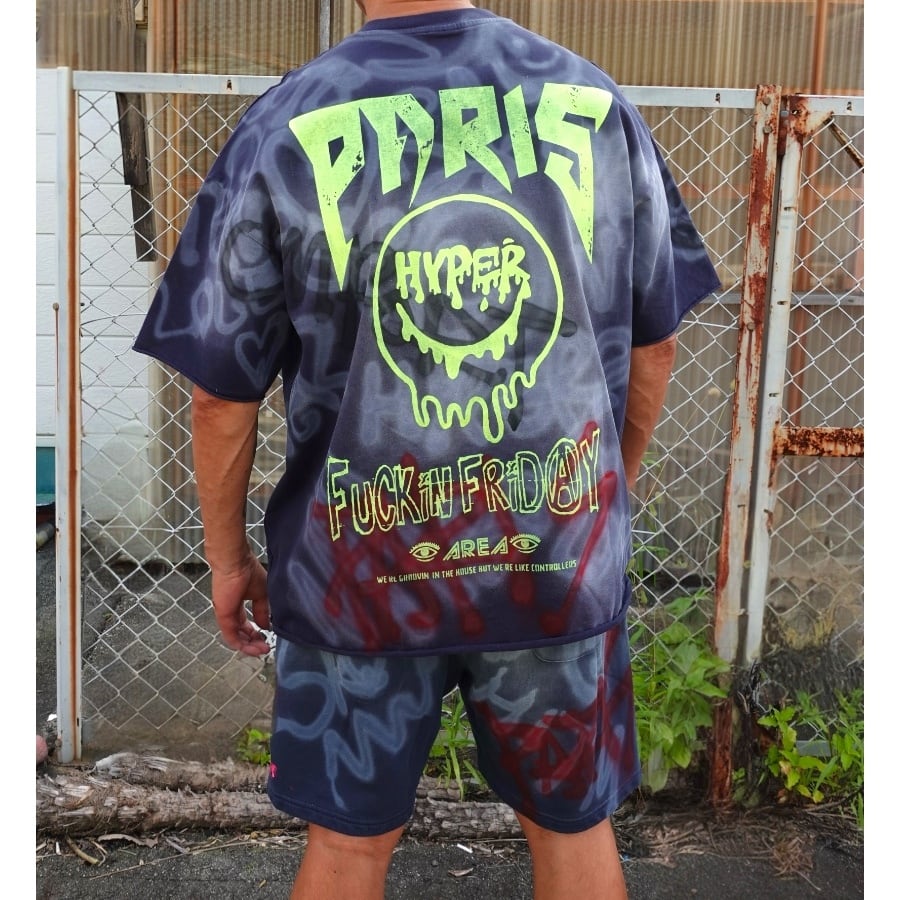 ダークトーンのベースカラーに、ネオンピンクやネオンイエローのグラフィックが映えるコントラストが魅力で、着るだけで目を引くスタイルに。