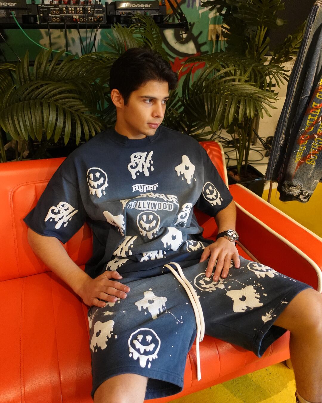 アイコニックなスマイルモチーフをドリップデザインで表現し、モノグラム柄と組み合わせた独自のアートワークが印象的。