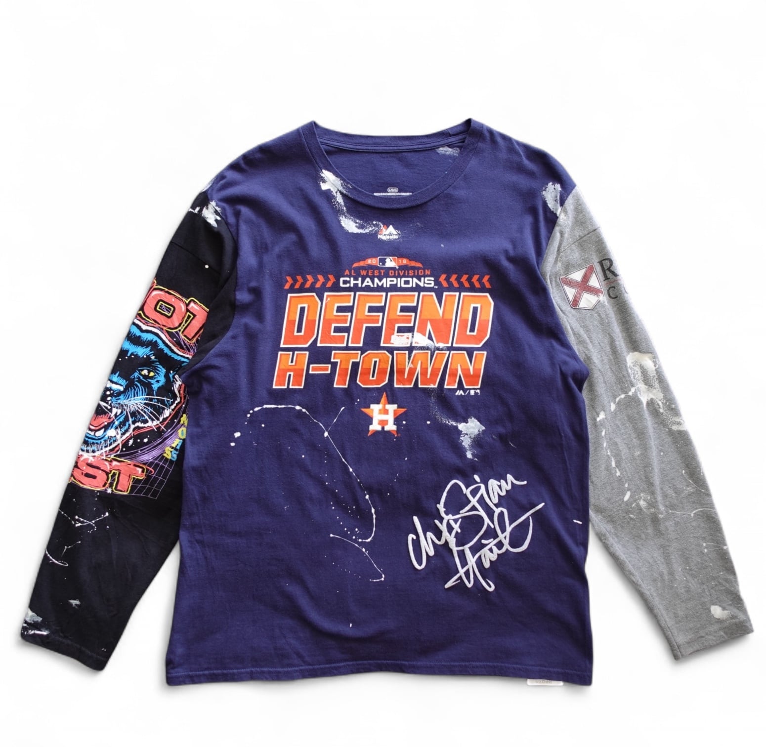 海外のスポーツTシャツをテーマに、3枚のヴィンテージTシャツを組み合わせ、大胆なペイントアートと立体感のあるグラフィックアートを施しました。