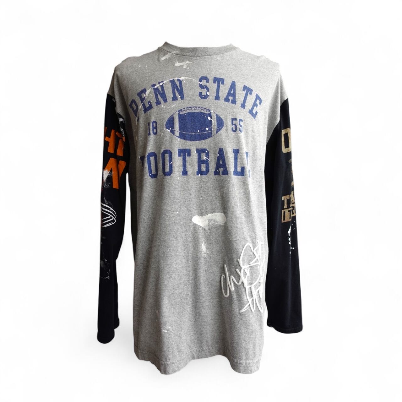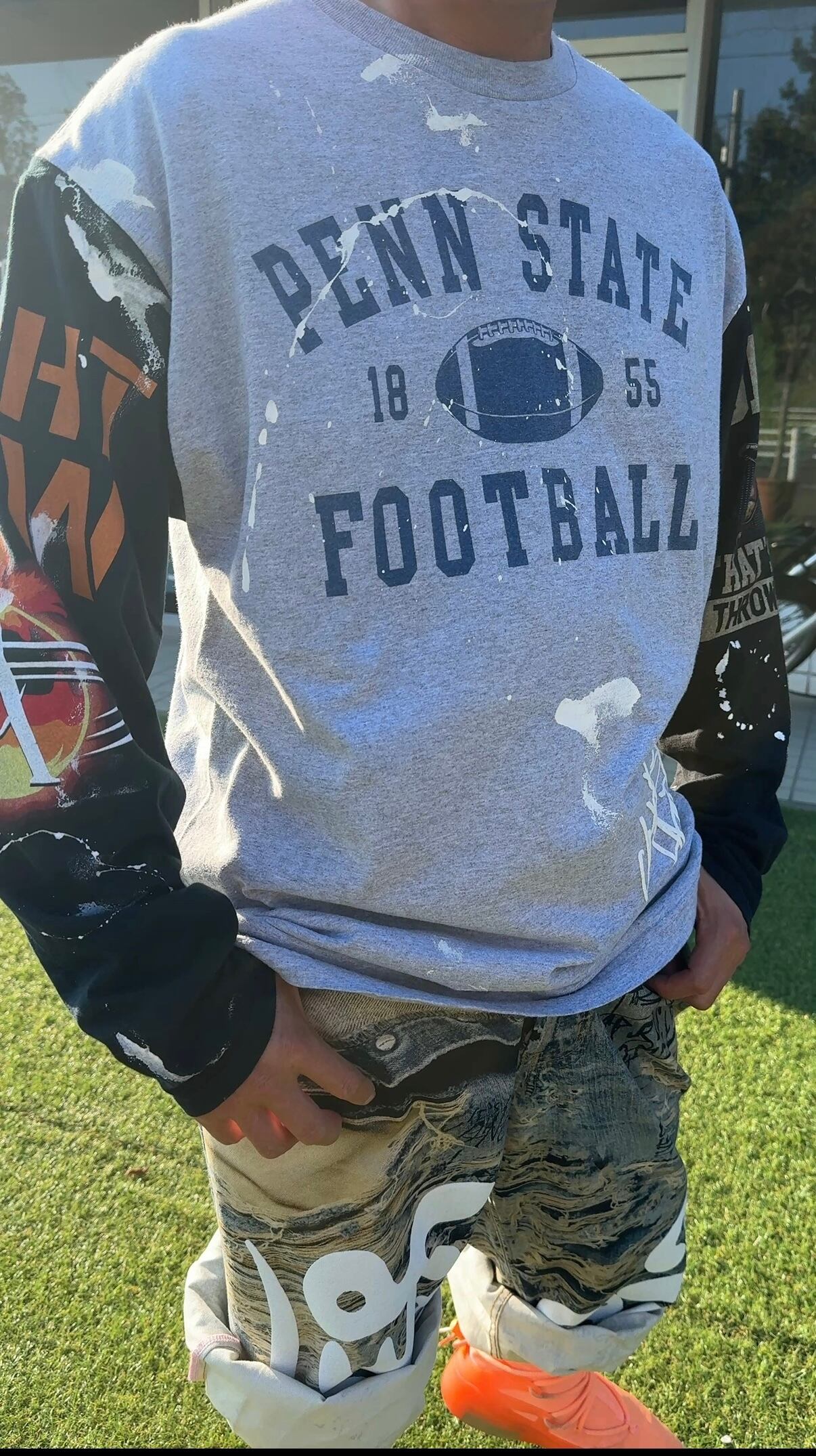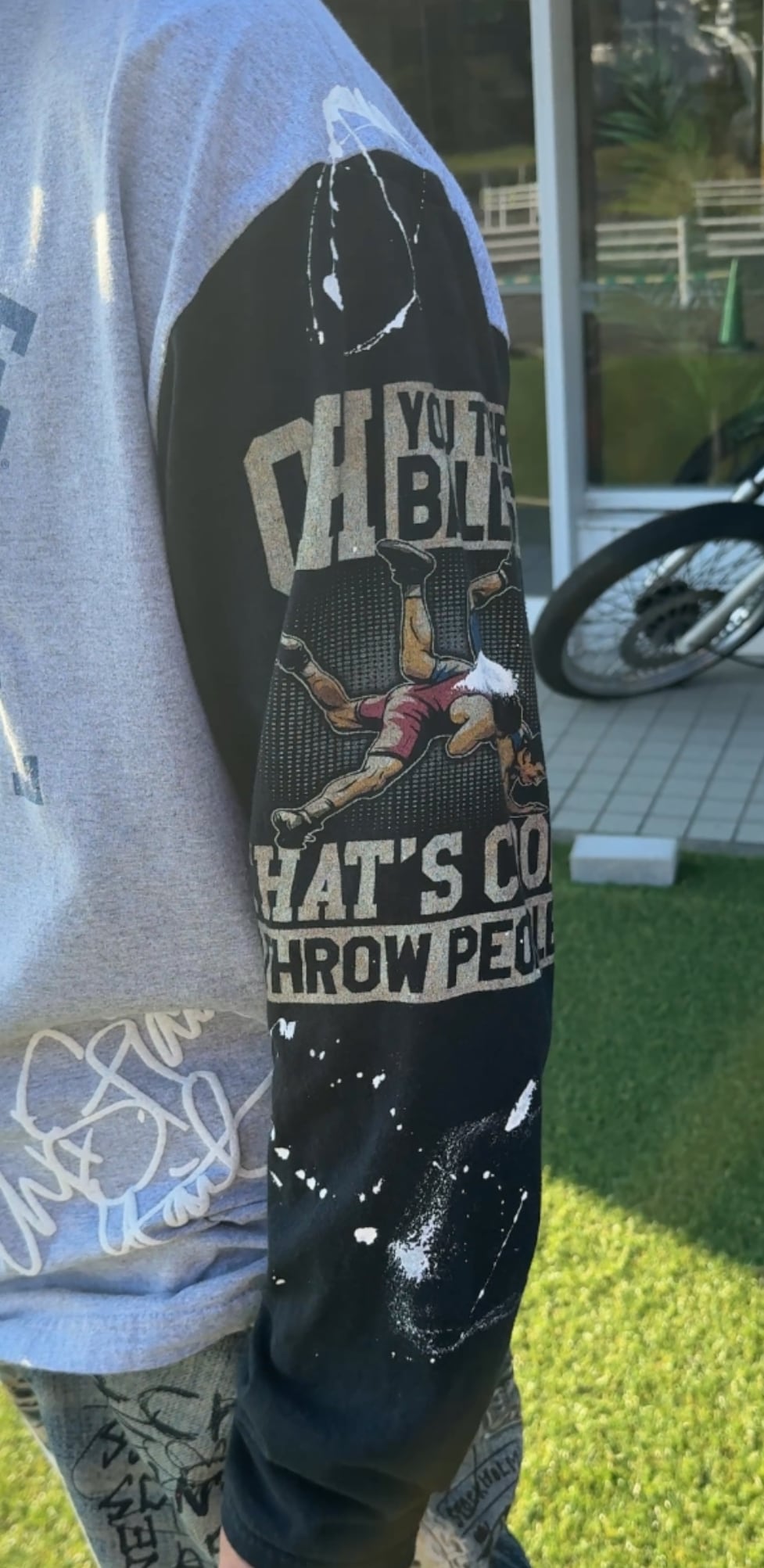 海外のスポーツTシャツをテーマに、3枚のヴィンテージTシャツを組み合わせ、大胆なペイントアートと立体感のあるグラフィックアートを施しました。