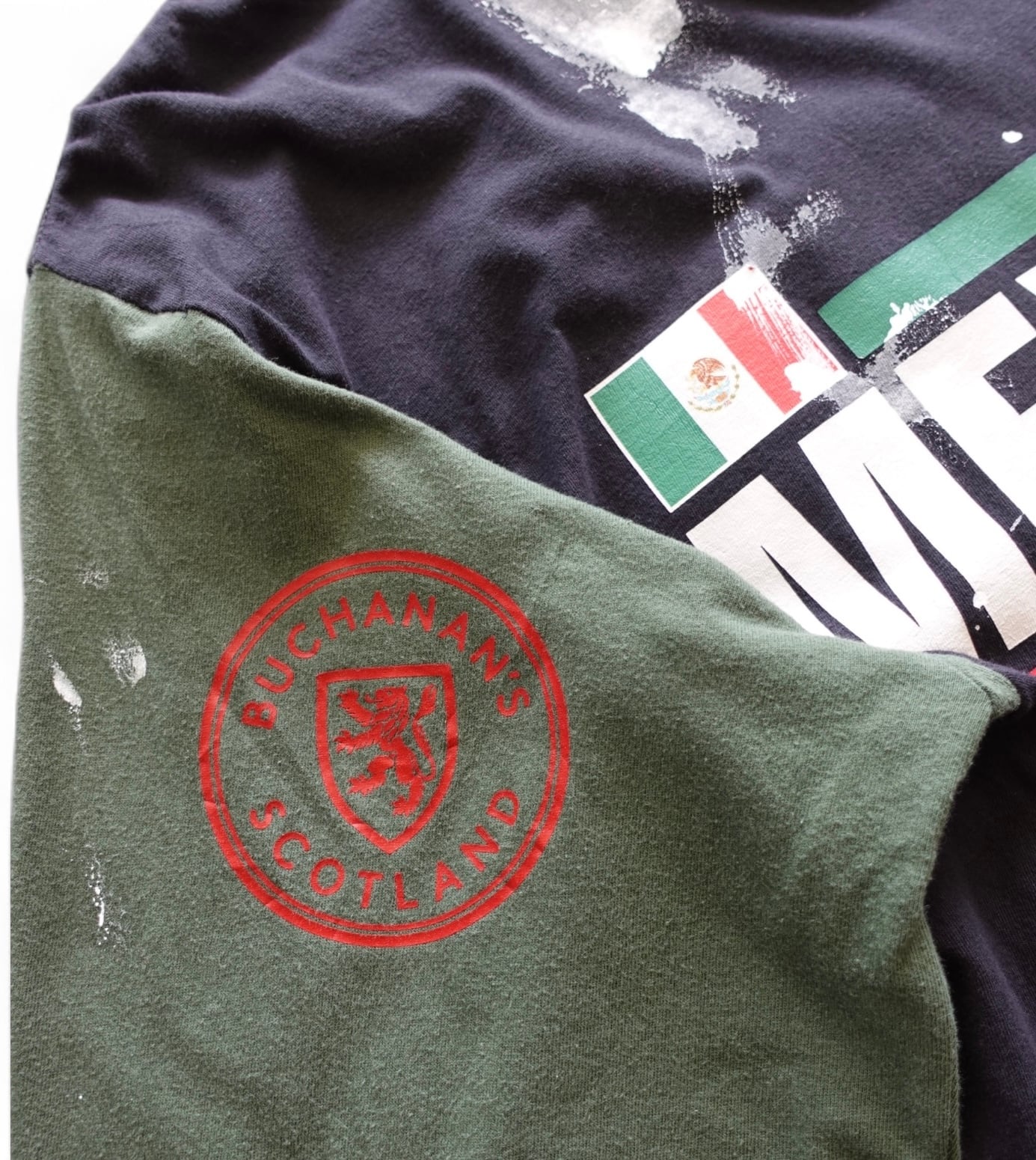 海外のスポーツTシャツをテーマに、3枚のヴィンテージTシャツを組み合わせ、大胆なペイントアートと立体感のあるグラフィックアートを施しました。