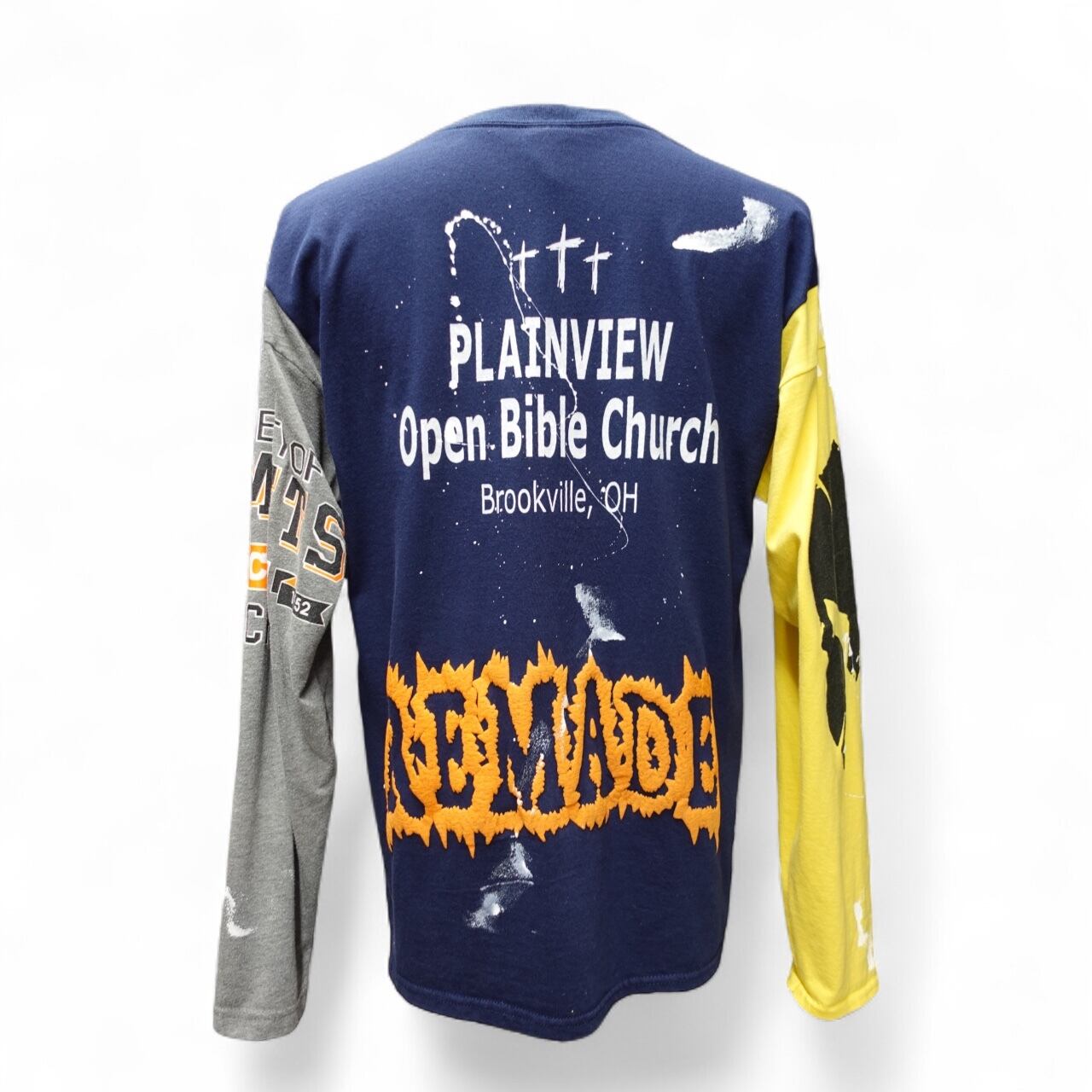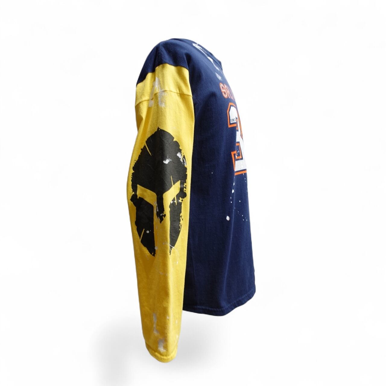 海外のスポーツTシャツをテーマに、3枚のヴィンテージTシャツを組み合わせ、大胆なペイントアートと立体感のあるグラフィックアートを施しました。