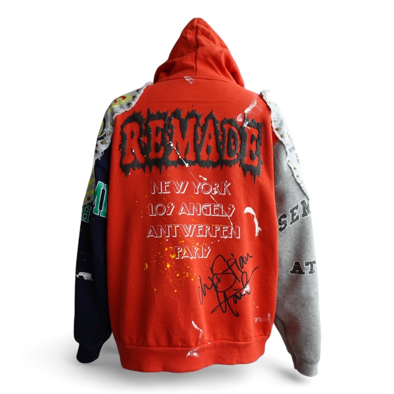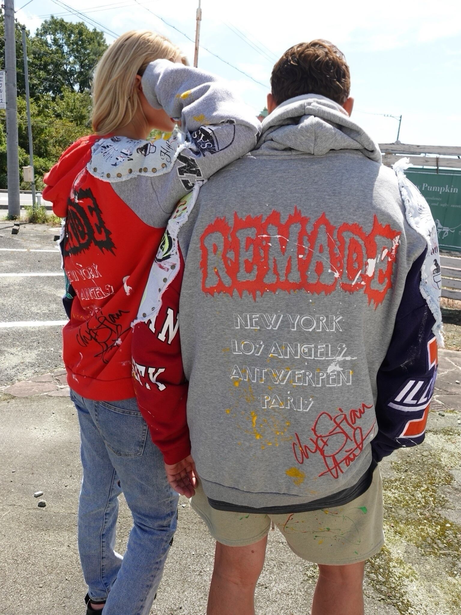 フロントボディにはヴィンテージのPUMAパーカーを採用し、両袖には異なるトレーナー生地をリミックス。さらに肩パット部分にはLevi’sのデニムを使用し、ゴールドのスタッズを一点ずつ手作業で施しています。