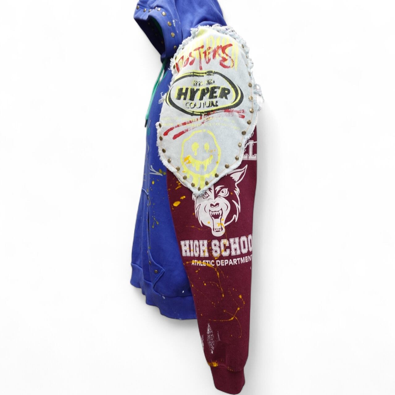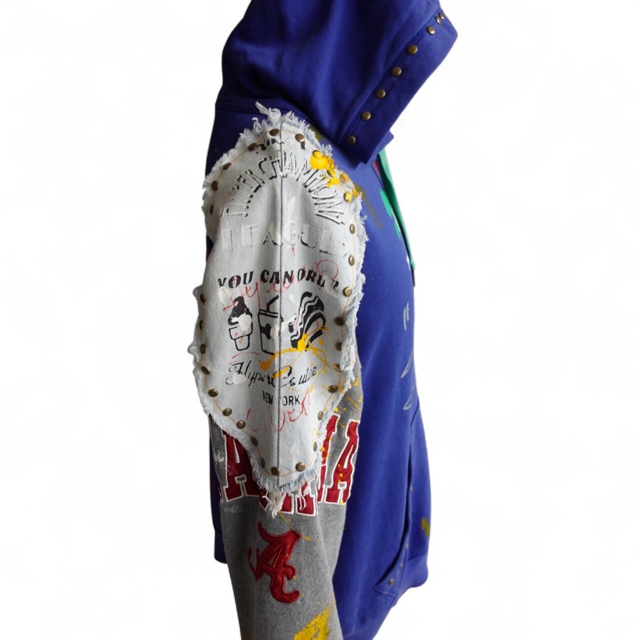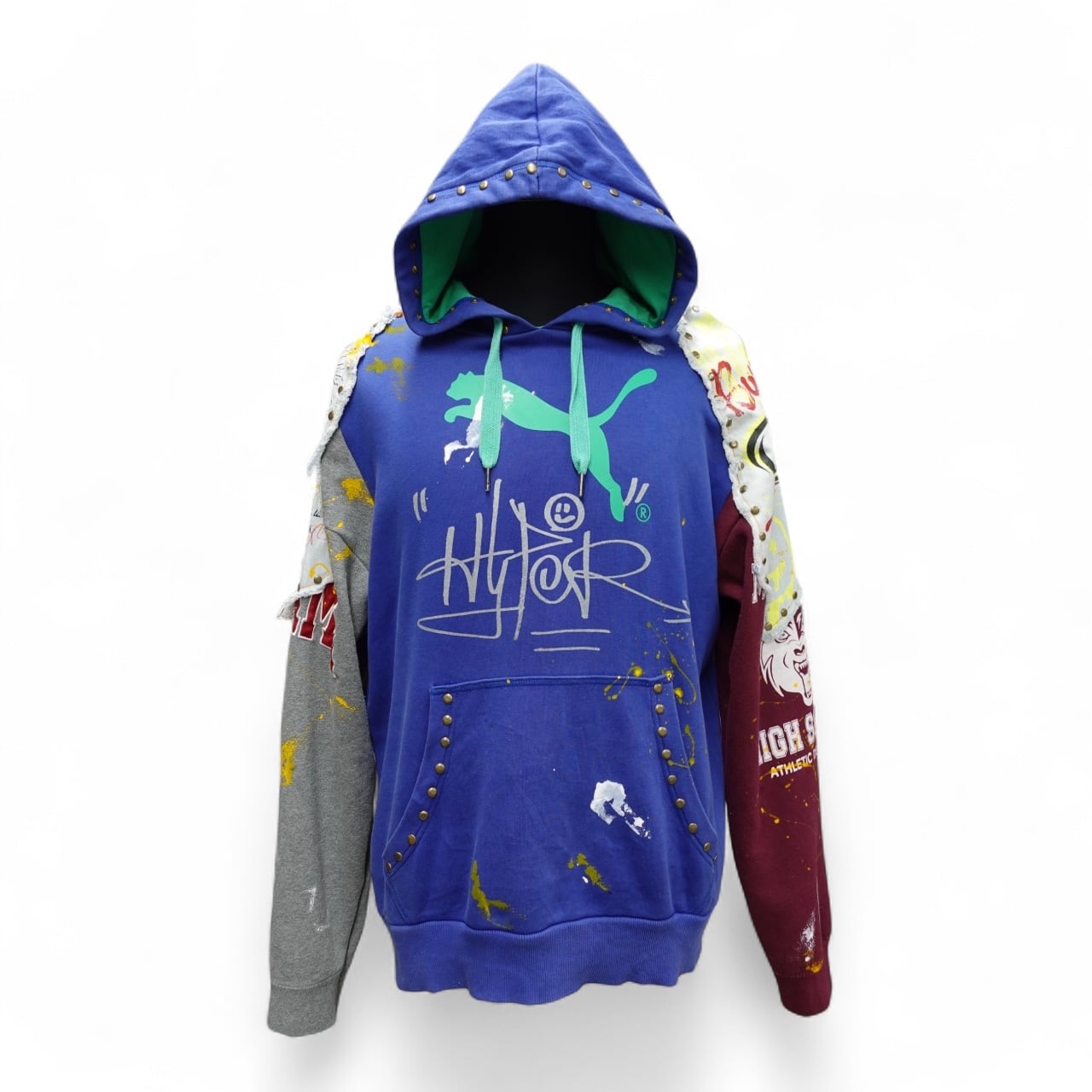 フロントボディにはヴィンテージのPUMAパーカーを採用し、両袖には異なるトレーナー生地をリミックス。さらに肩パット部分にはLevi’sのデニムを使用し、ゴールドのスタッズを一点ずつ手作業で施しています。