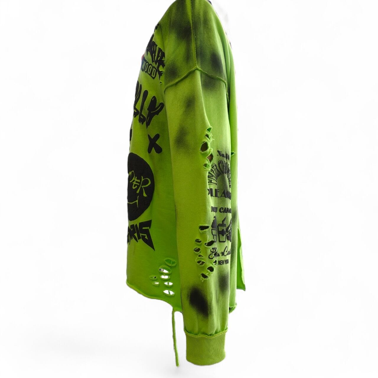 スウェットならではの軽やかな着心地で、季節の変わり目にも快適に着用可能。程よいブロークン加工と切りっぱなしのボディデザインが、ストリート感を演出します。