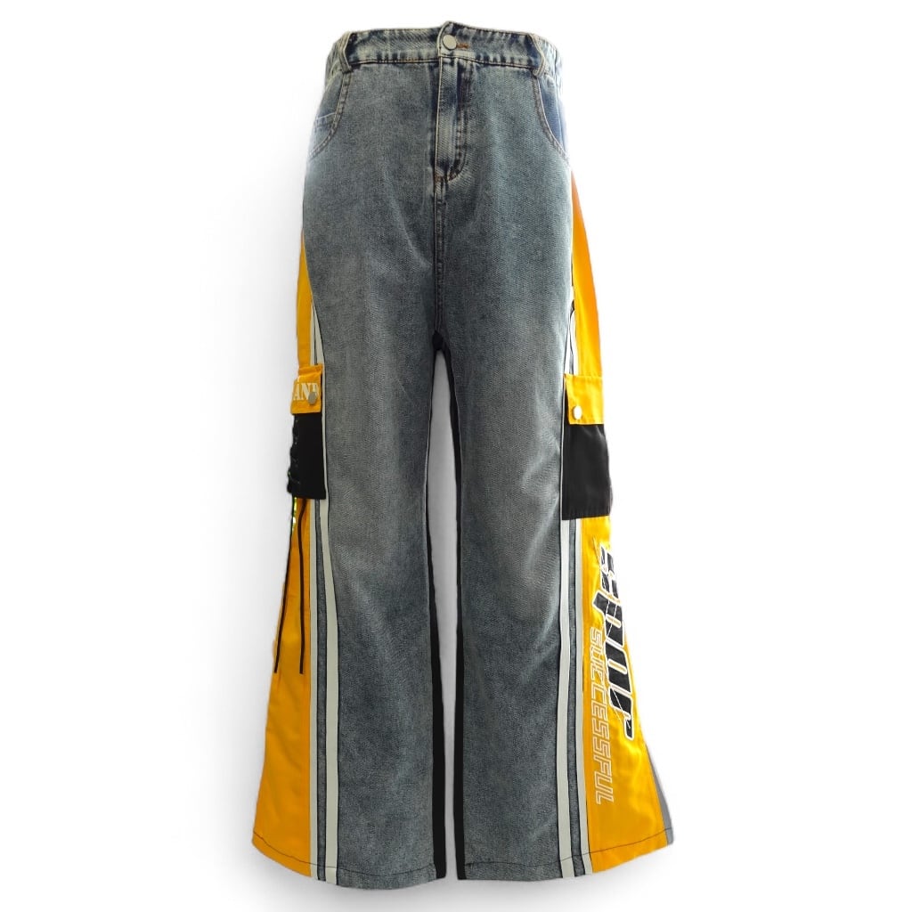 デニムとナイロン素材を組み合わせたリメイクワイドパンツ。