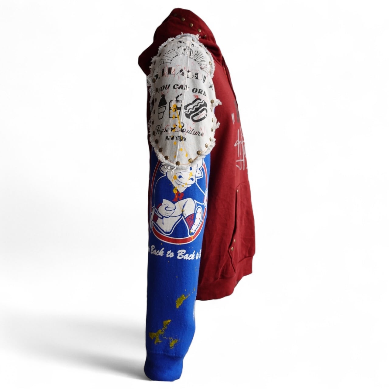 フロントボディにはヴィンテージのPUMAパーカーを採用し、両袖には異なるトレーナー生地をリミックス。さらに肩パット部分にはLevi’sのデニムを使用し、ゴールドのスタッズを一点ずつ手作業で施しています。