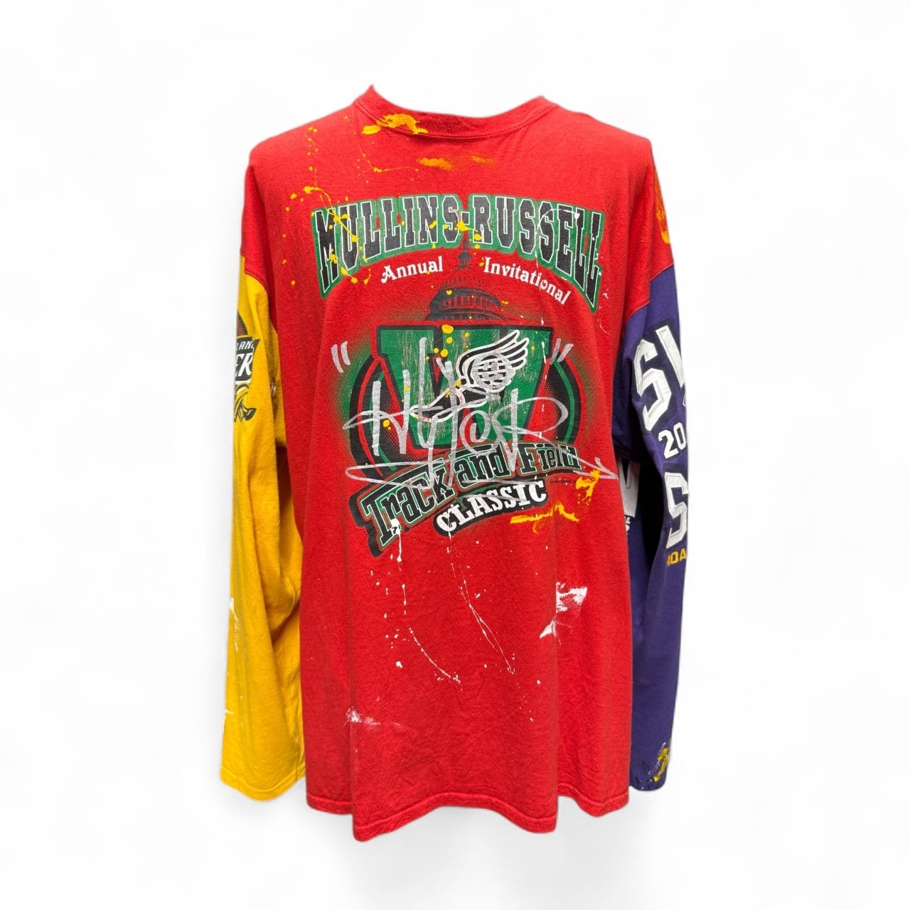 ヴィンテージTシャツを3枚使用し、袖ごとに再構築したリメイクロングTシャツ。