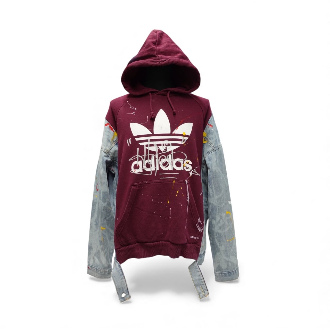 フロントボディには厳選されたヴィンテージ Adidas フーディを採用し、両袖にはデニムジャケットをリメイク。異素材のコントラストが際立つ、存在感のあるデザインに仕上げています。