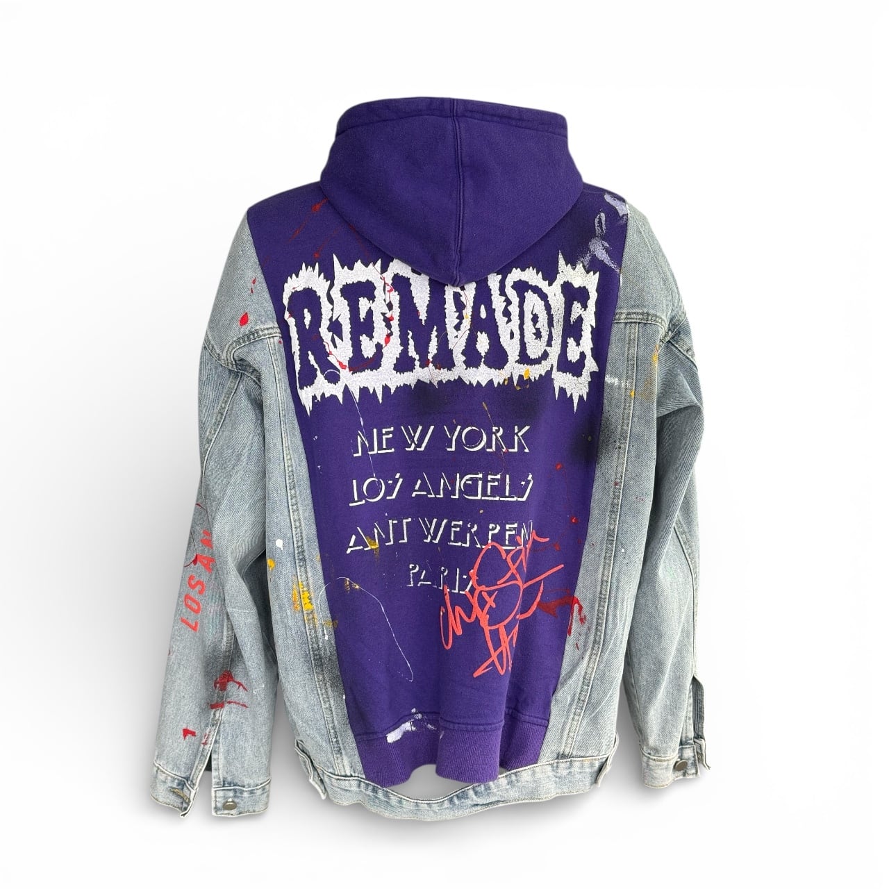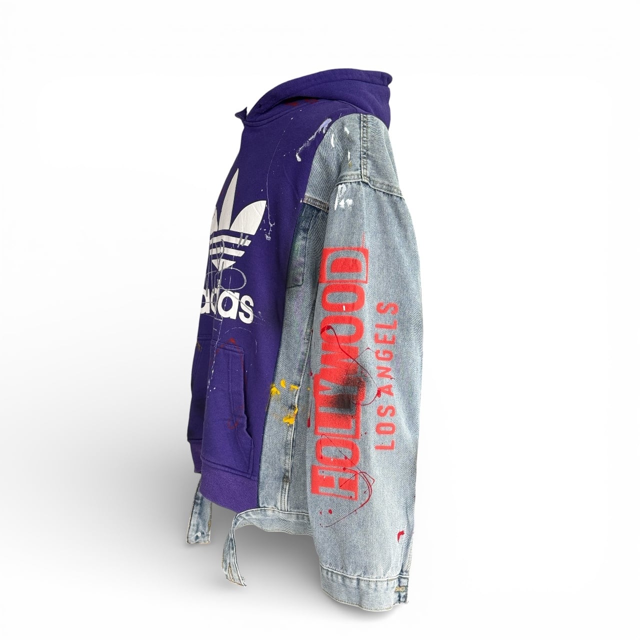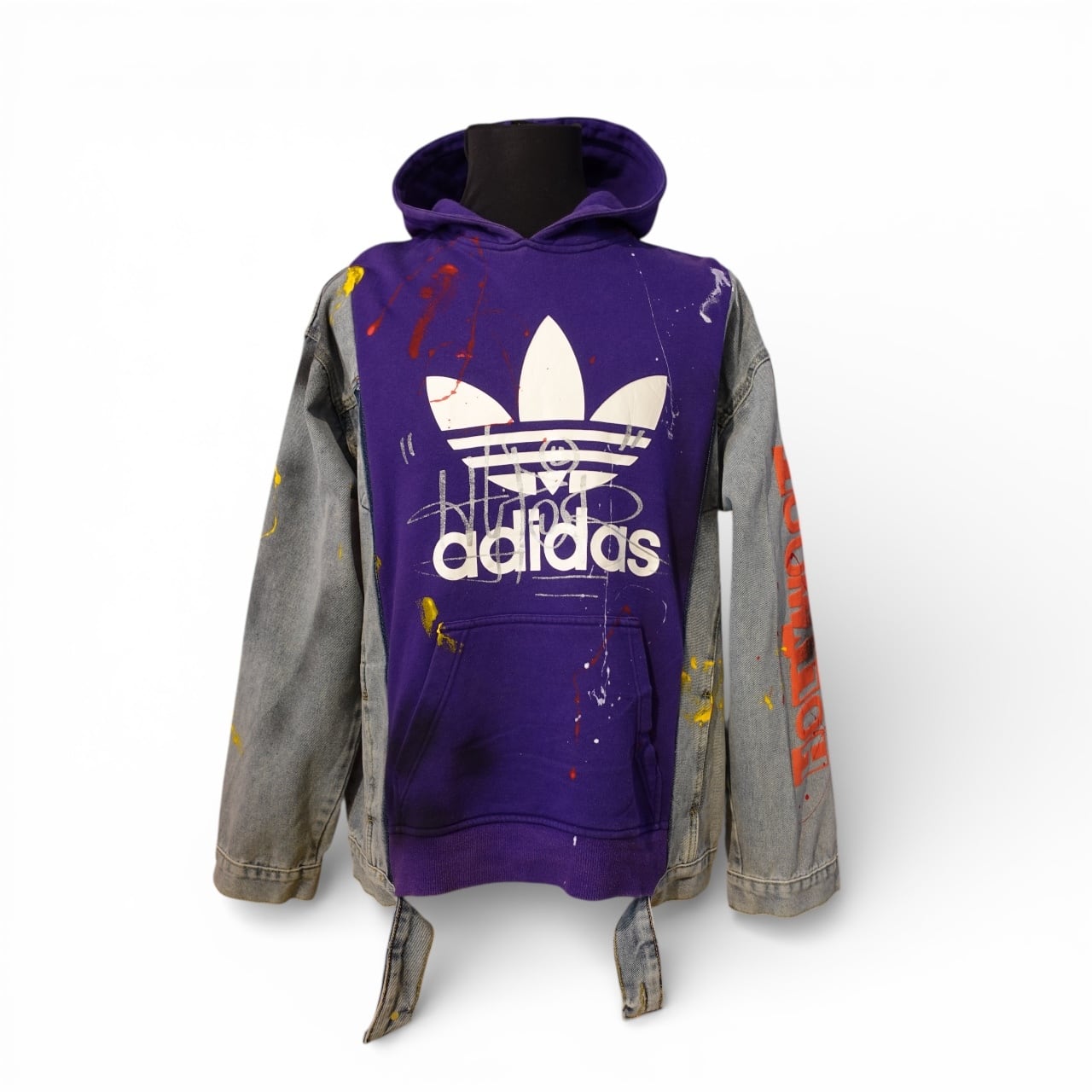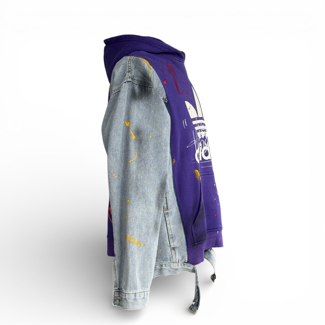 フロントボディには厳選されたヴィンテージ Adidas フーディを採用し、両袖にはデニムジャケットをリメイク。異素材のコントラストが際立つ、存在感のあるデザインに仕上げています。