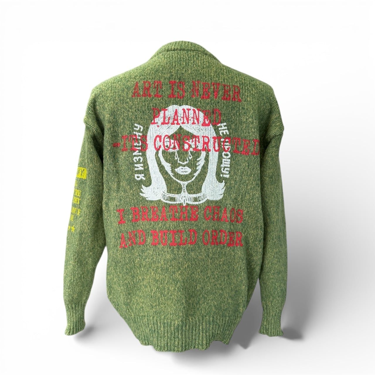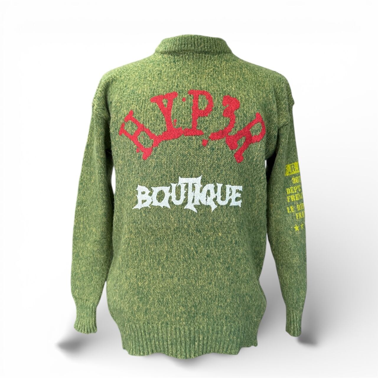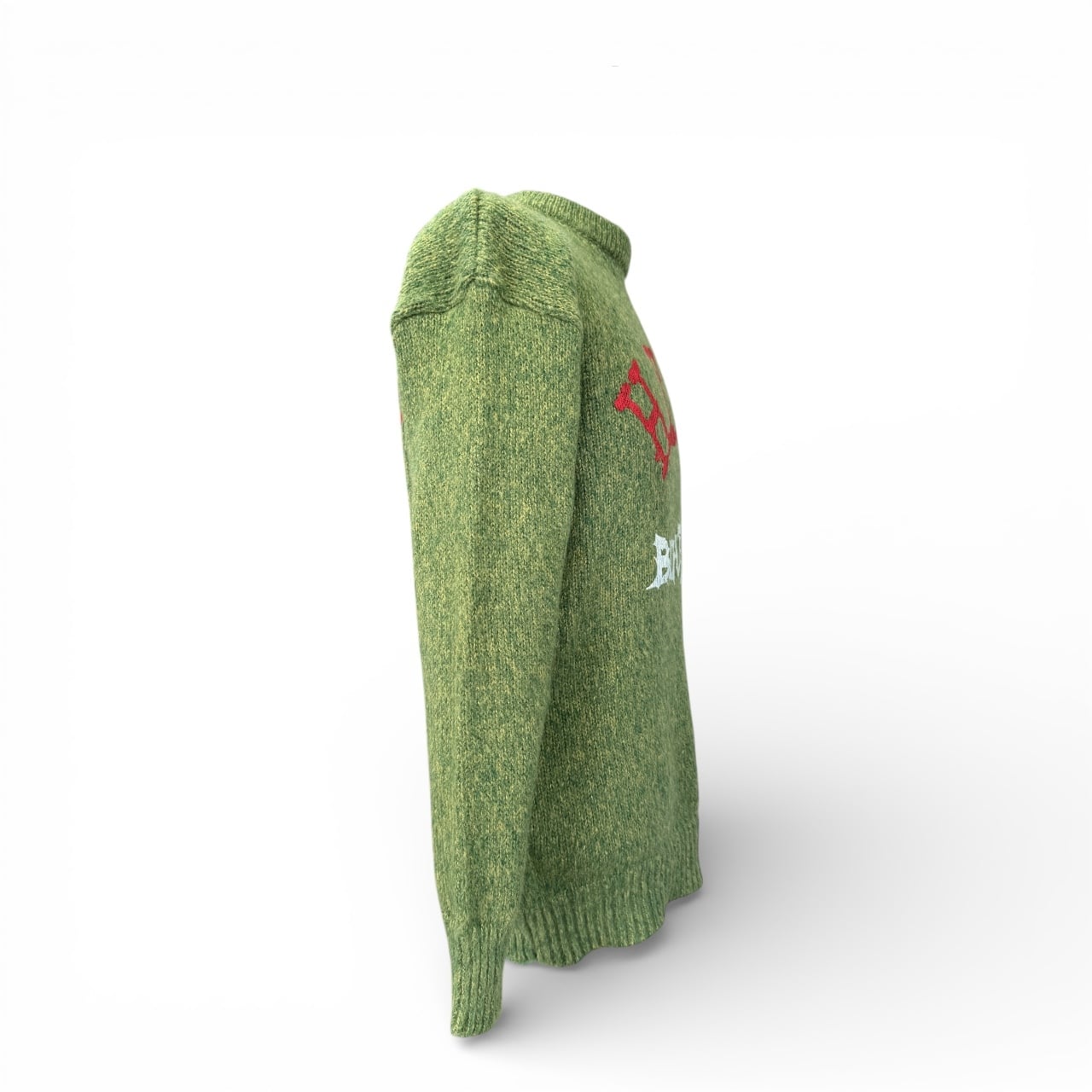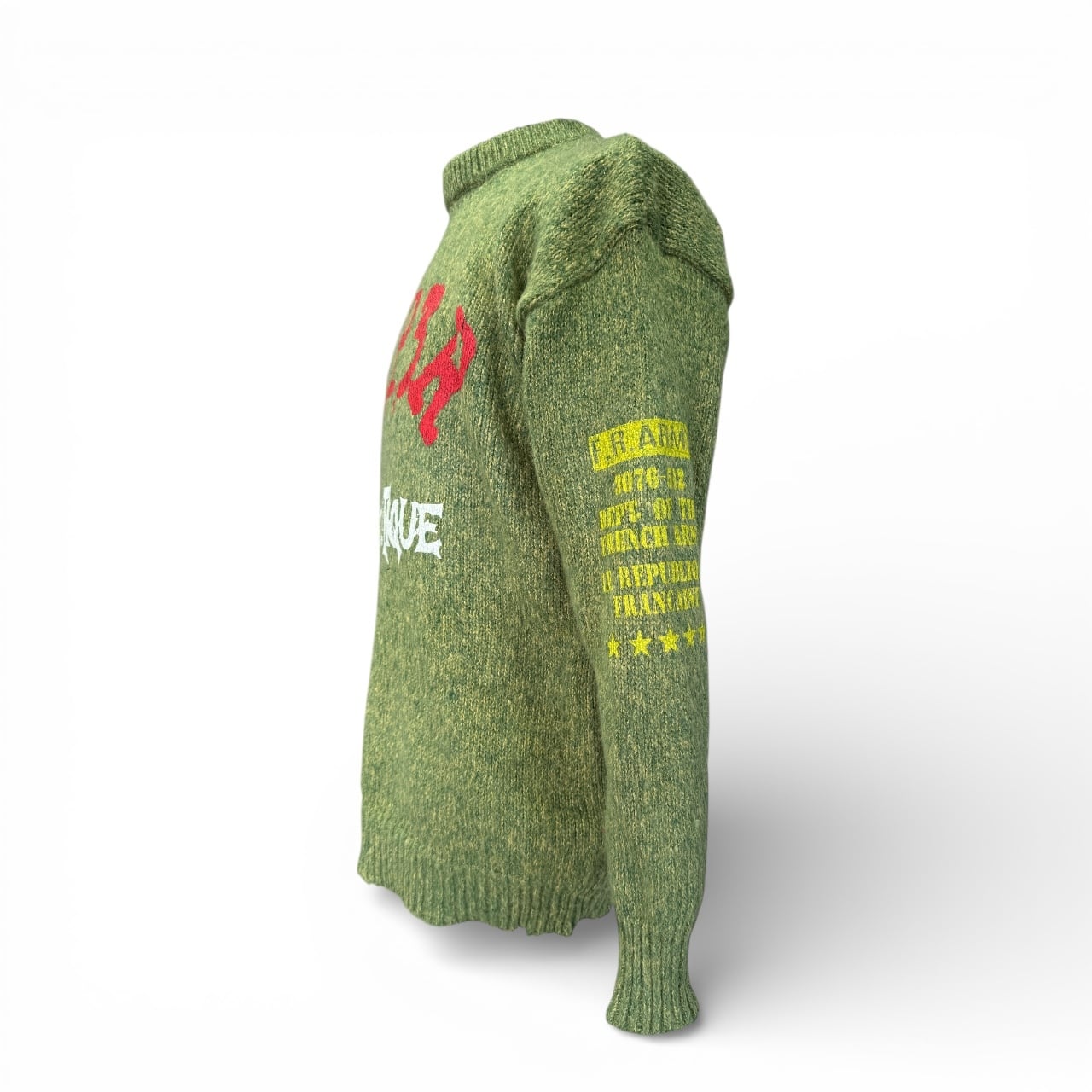 フロントとバックに印象的なロゴとメッセージを配した、存在感のあるニットプルオーバーです。