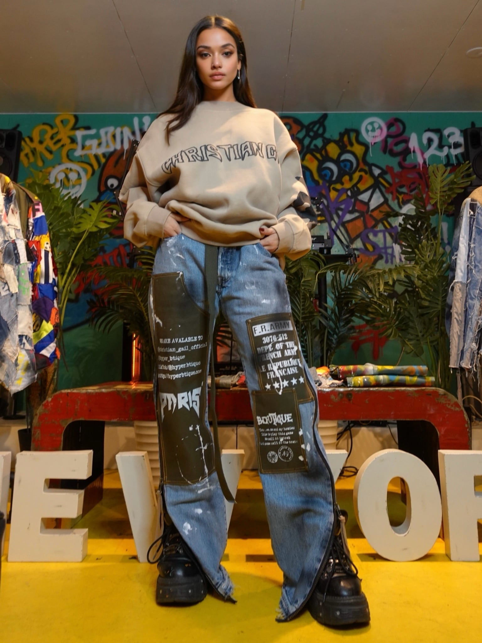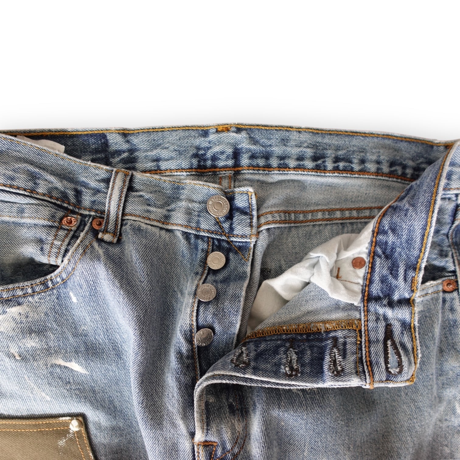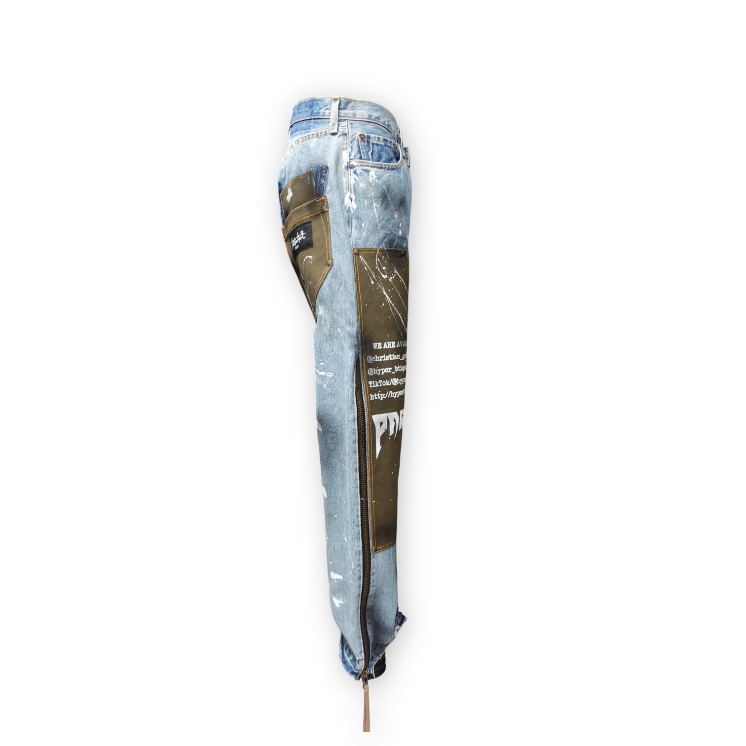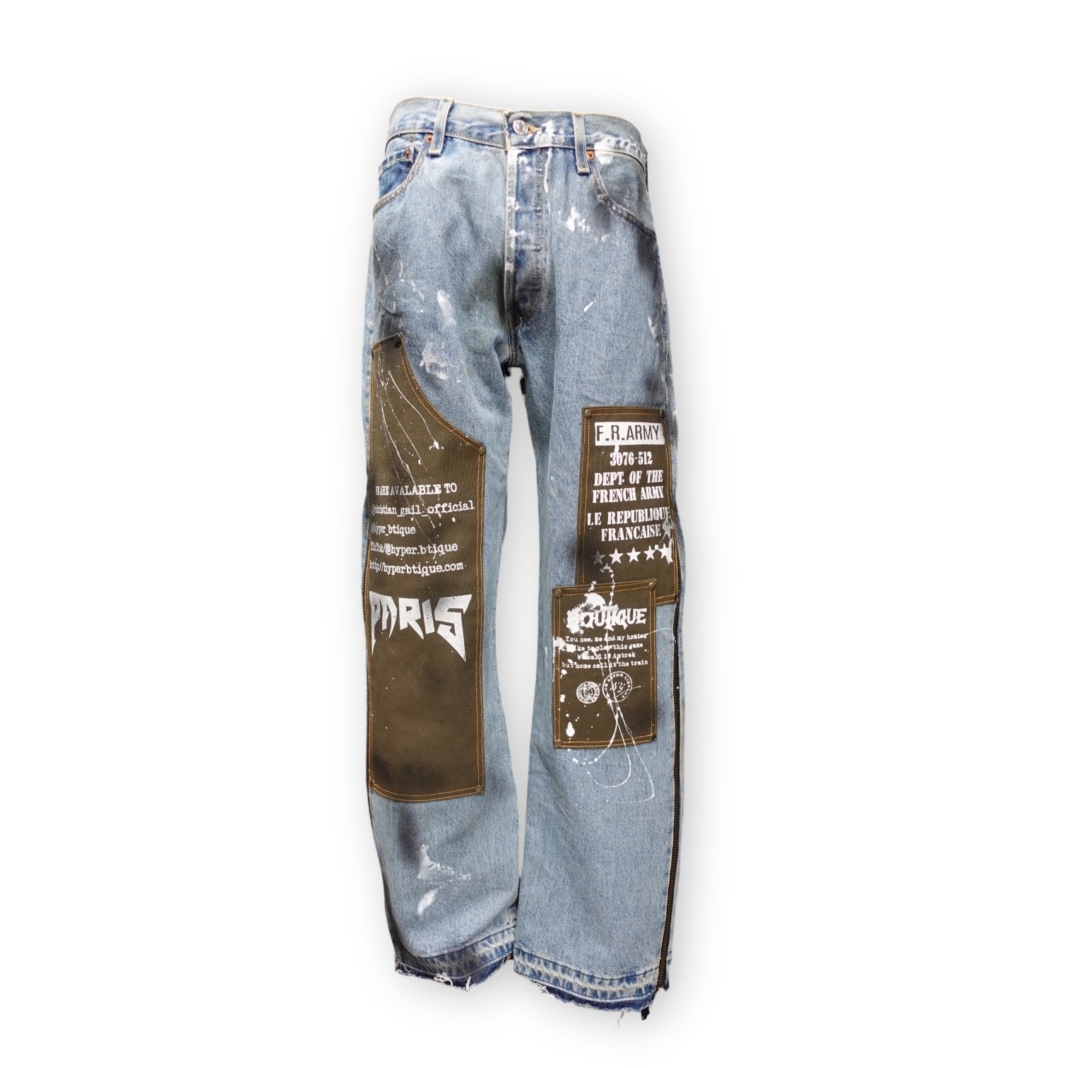LIVE’S 504をベースに、キャンバス地の切り替えとグラフィックアート、ペイントアートを施した、世界に一点のみのカスタムパンツです。