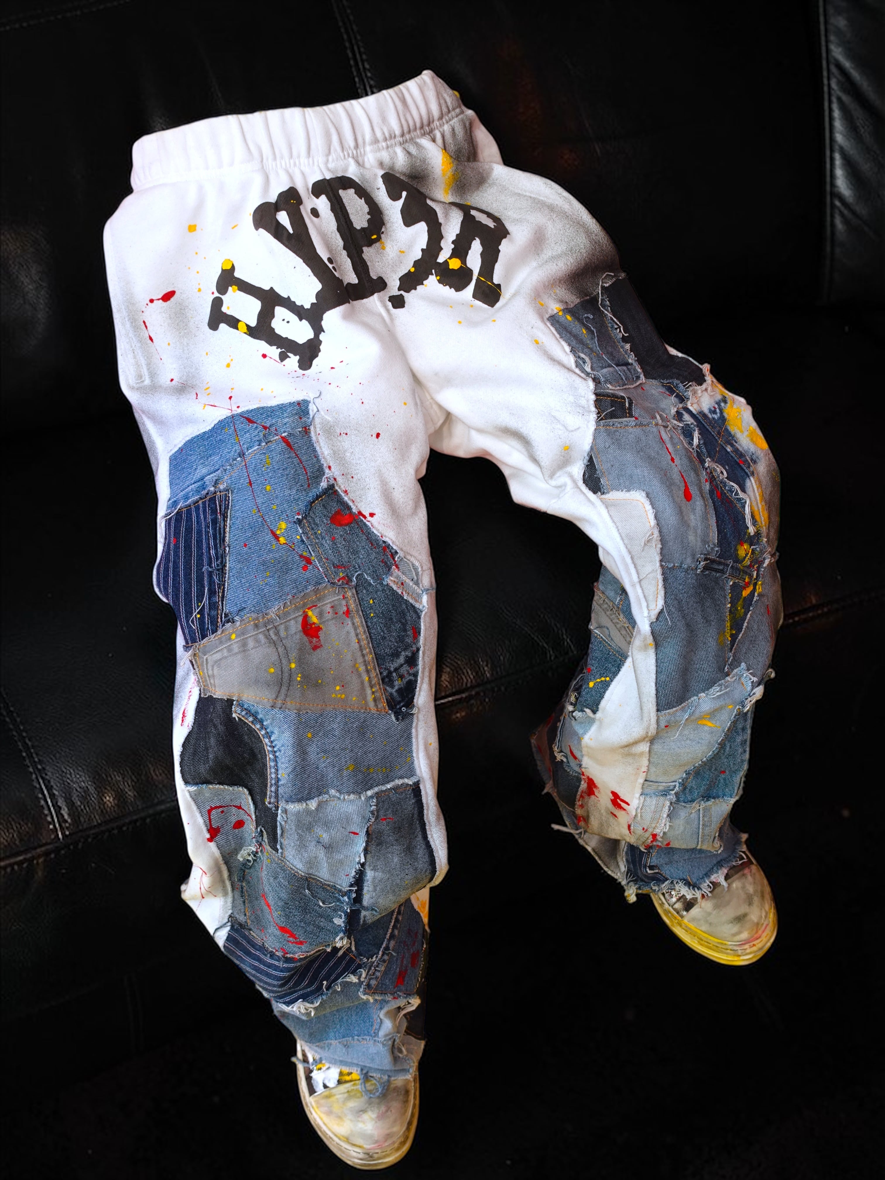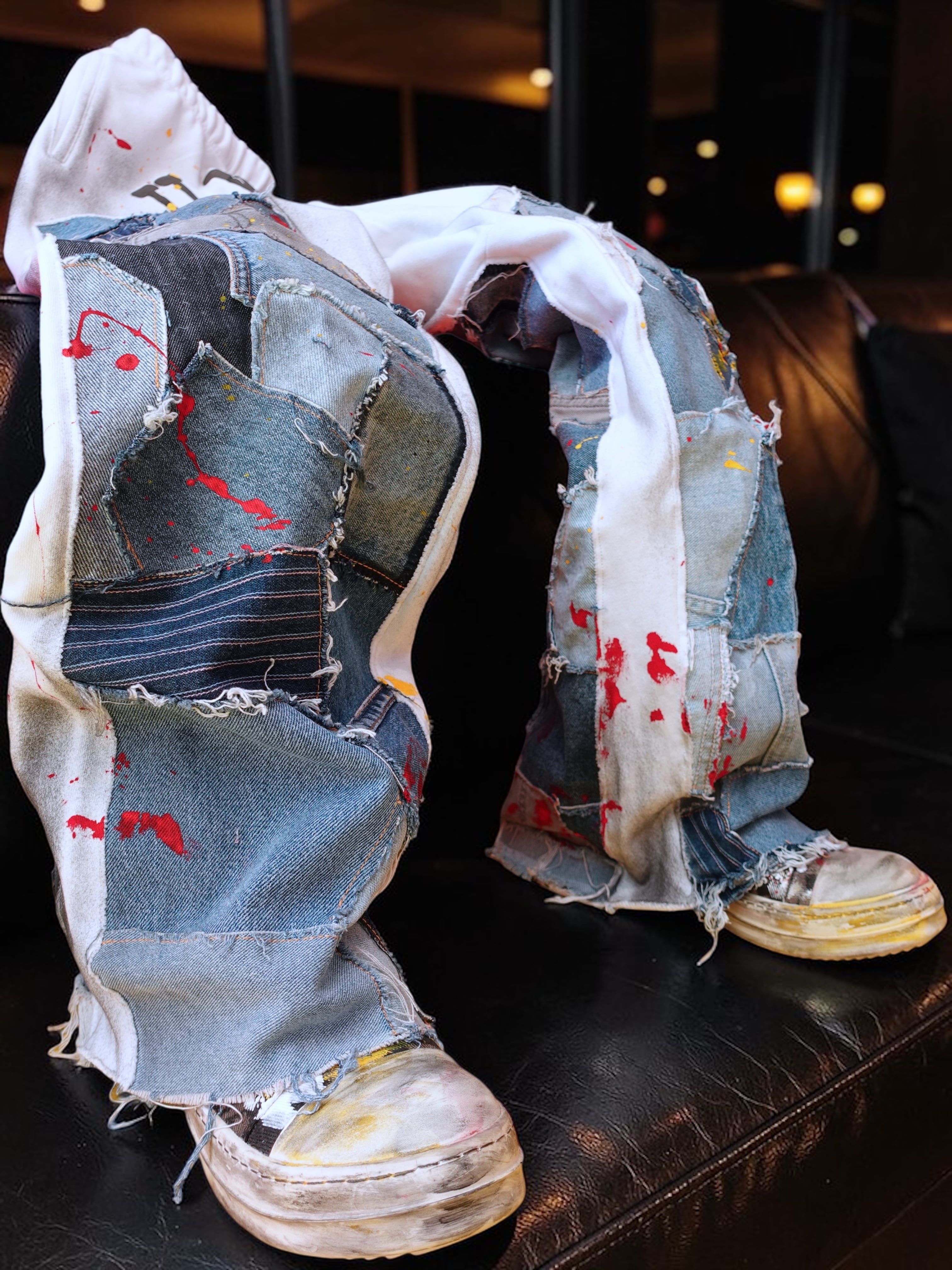 異なるデニム生地をパッチワーク状に組み合わせ、