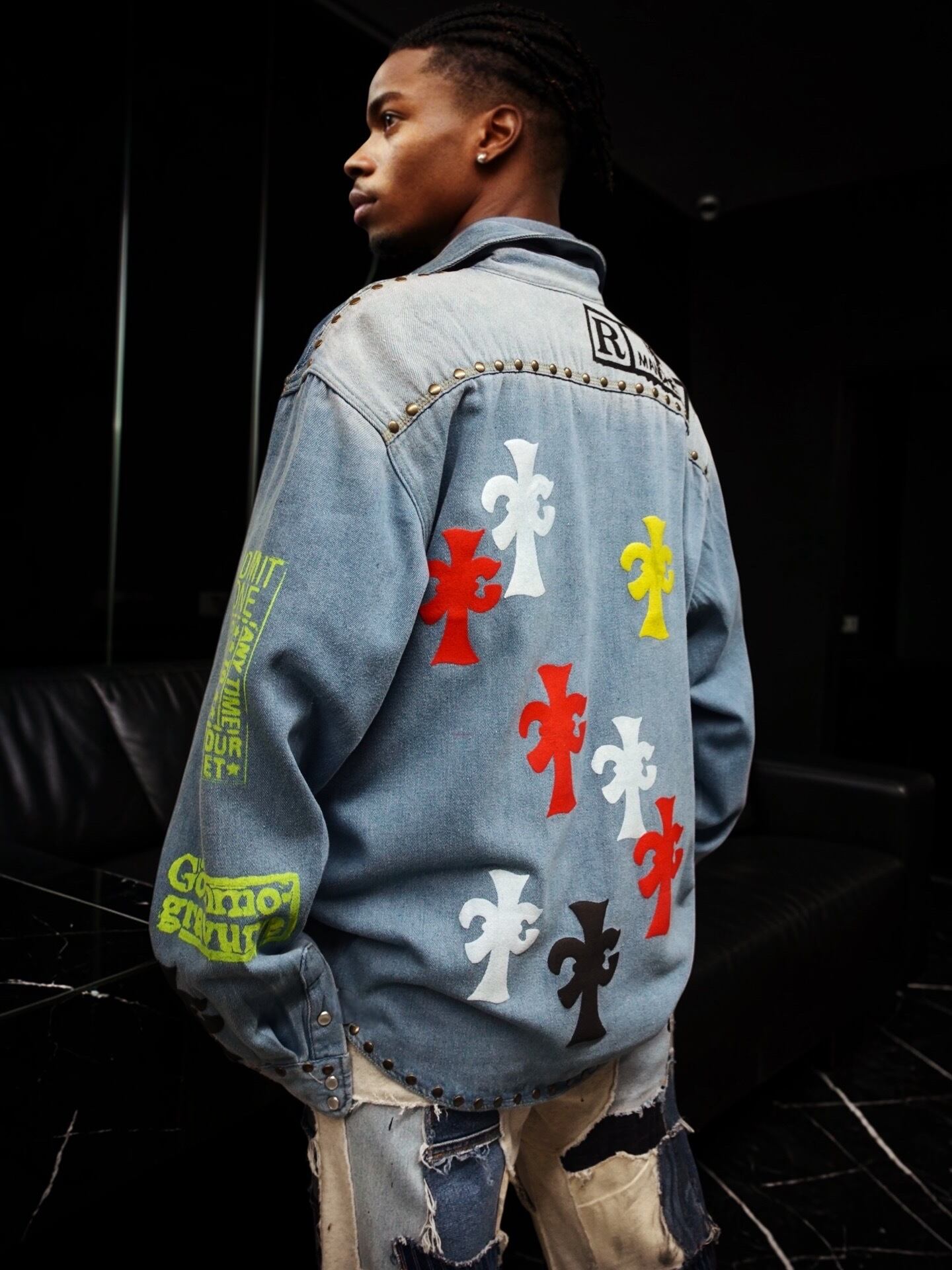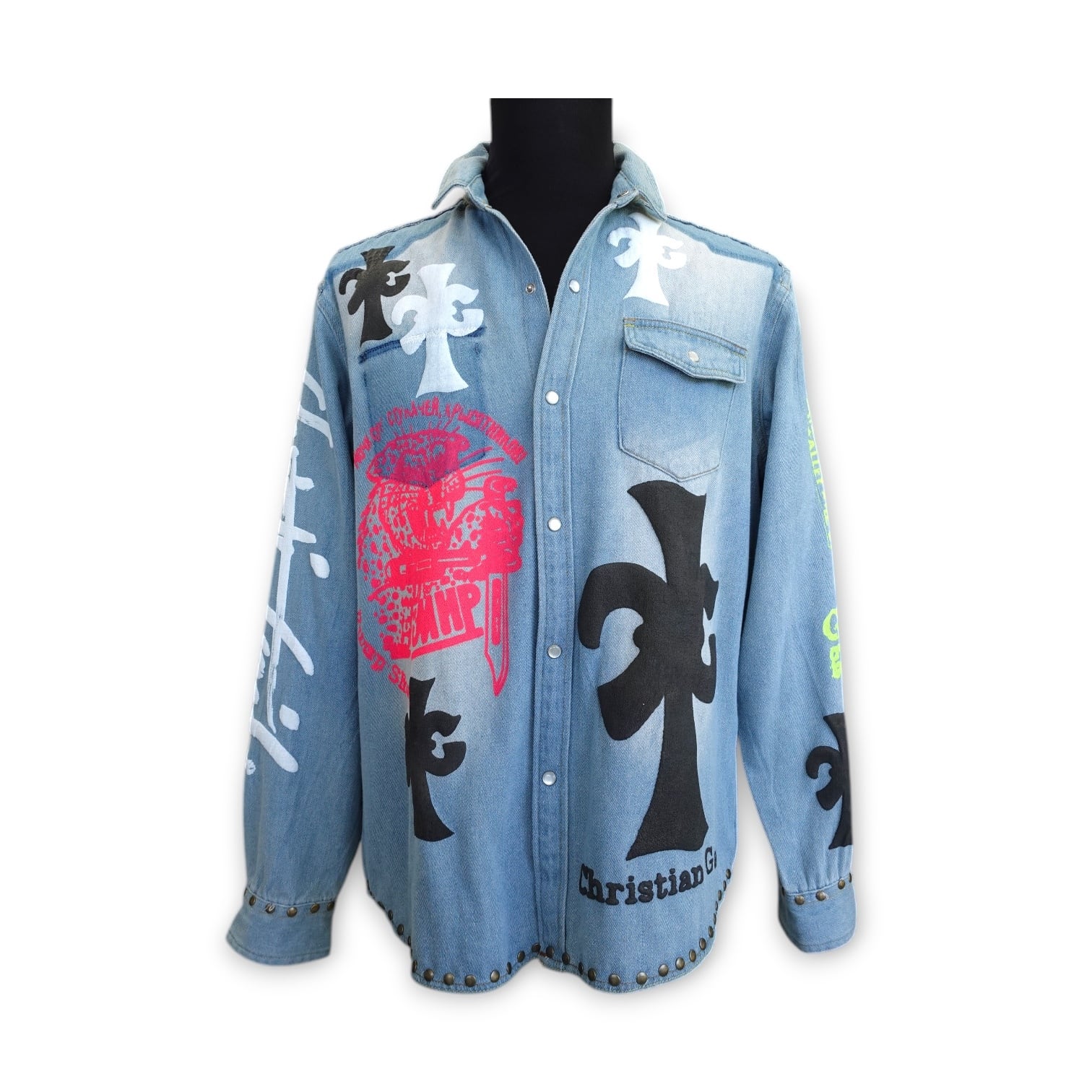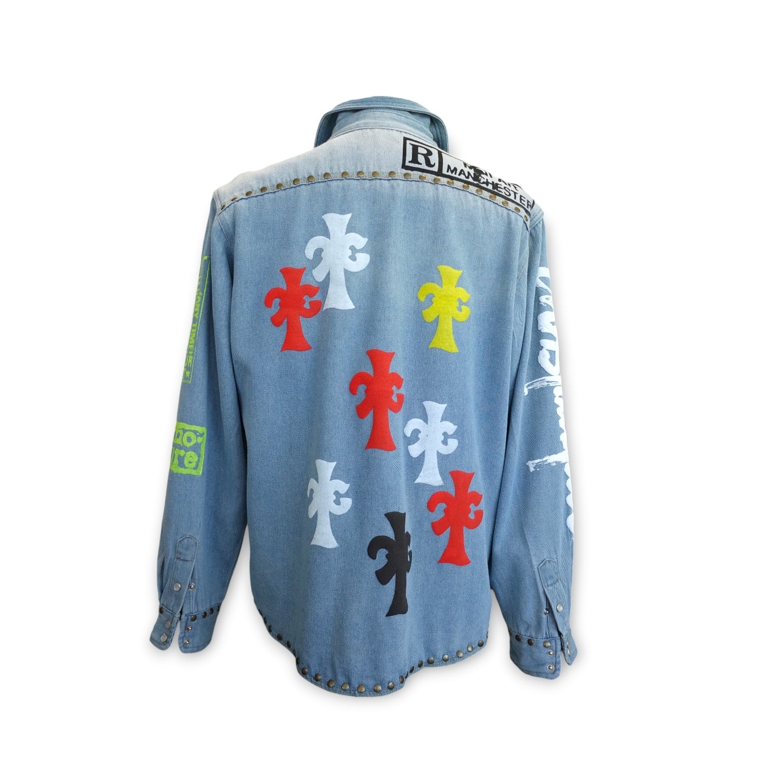 存在感のあるクロスモチーフが印象的なデニムシャツ。