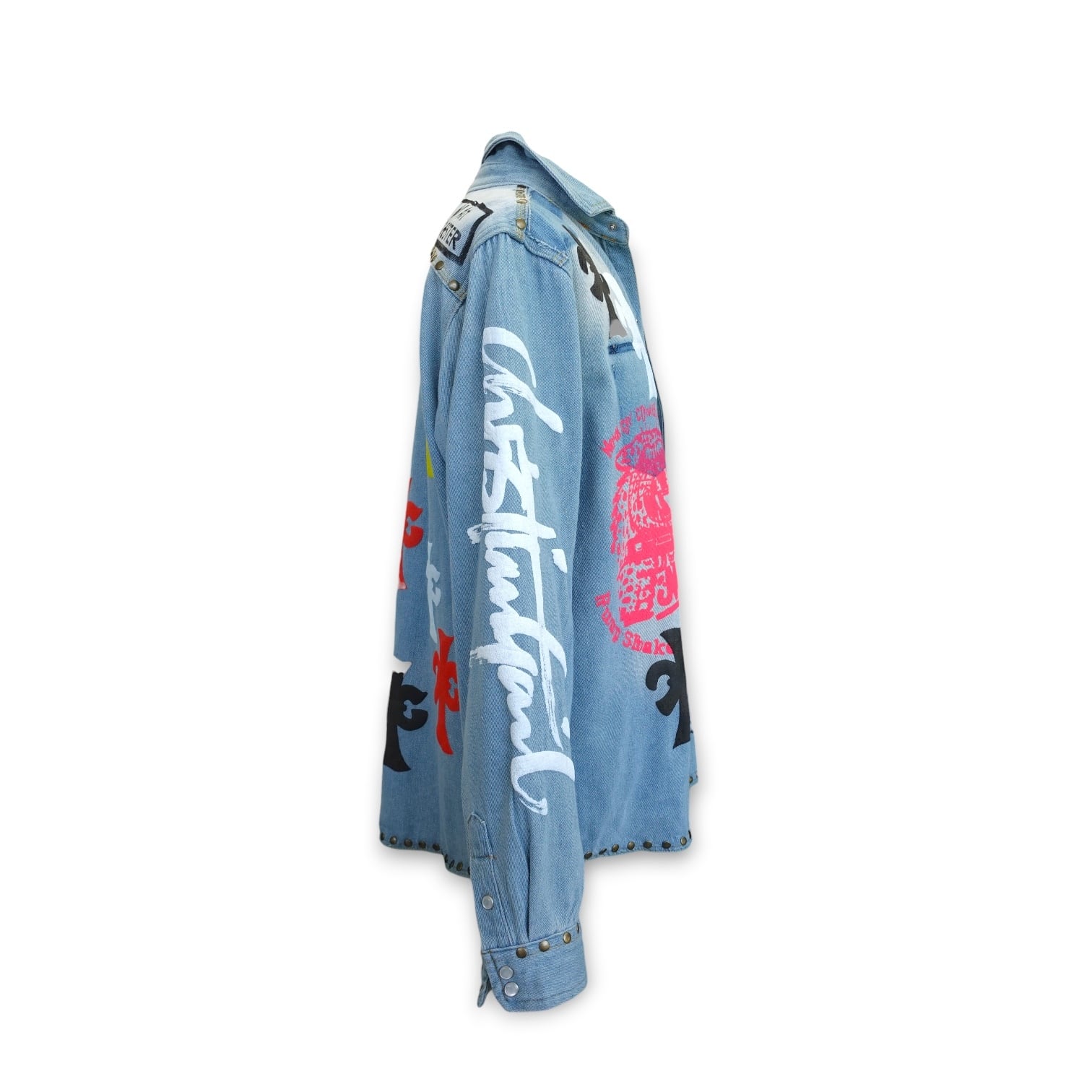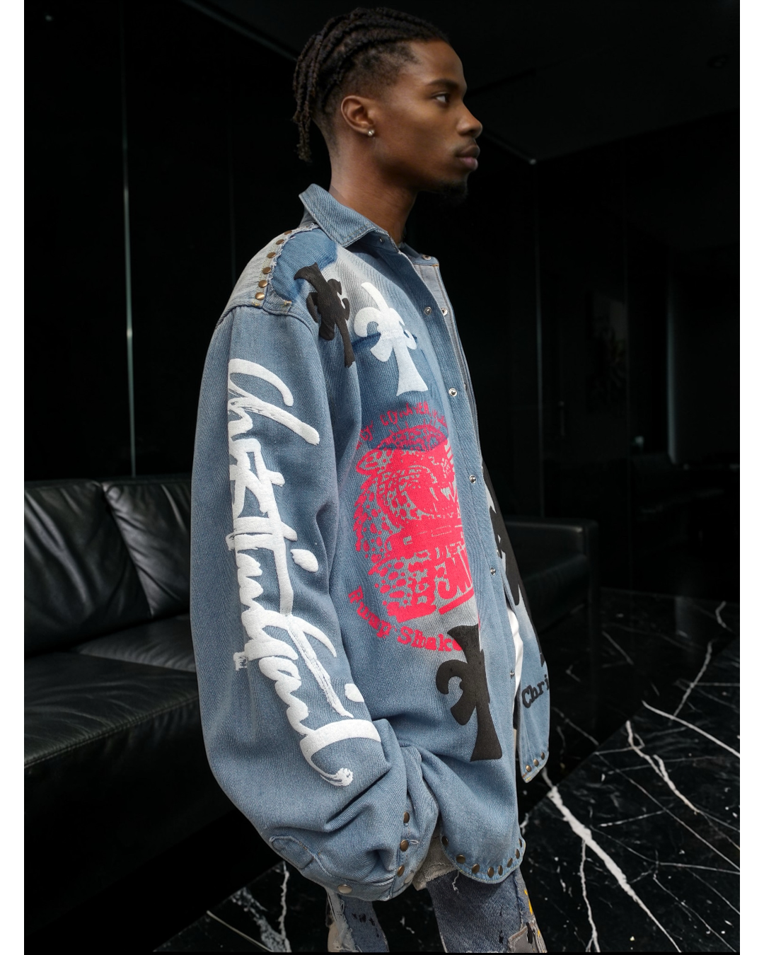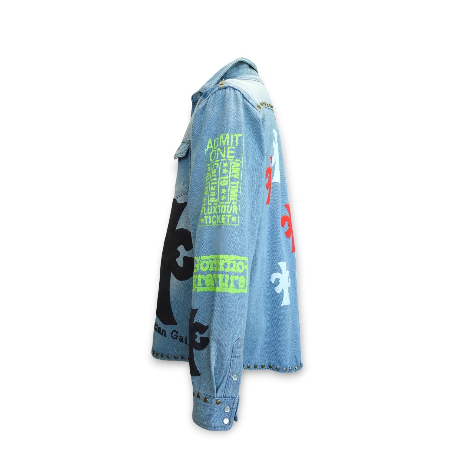 存在感のあるクロスモチーフが印象的なデニムシャツ。